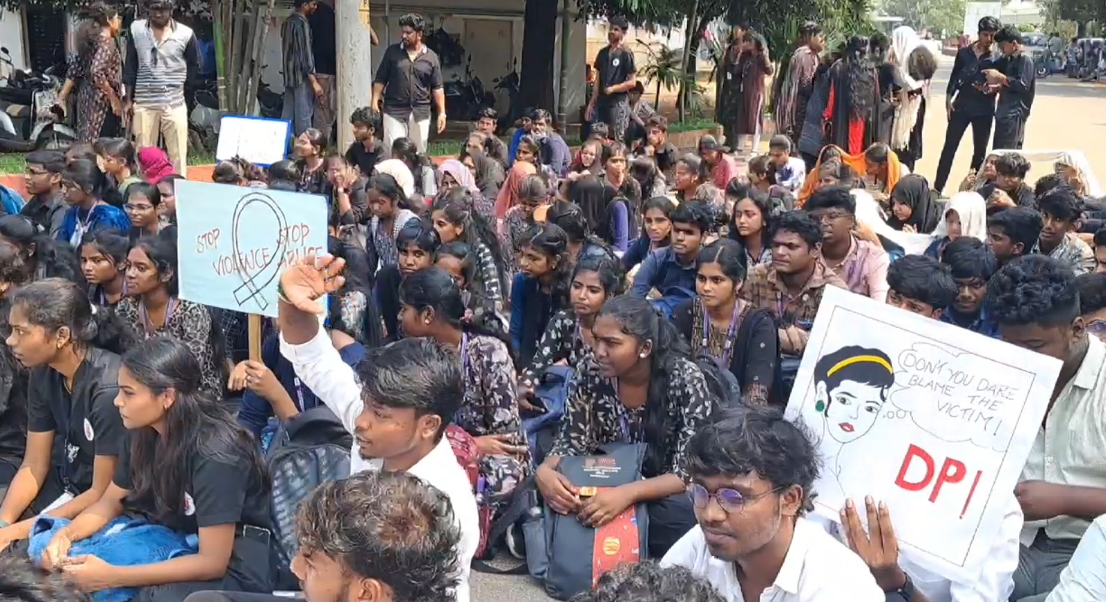 இந்நிலையில் மாணவிகள் மீதான பாலியல் துன்புறுத்தல்களை மூடி மறைக்கும் தனியார் கல்லூரி நிர்வாகத்தை கண்டித்தும், மாணவிகளிடம் பாலியல் சீண்டலில் ஈடுபட்ட நபர்களை பணிநீக்கம் செய்து சட்ட ரீதியான நடவடிக்கை எடுக்க வலியுறுத்தி, கல்லூரி மாணவ, மாணவிகள் கல்லூரி வளாகத்தில் போராட்டத்தில் ஈடுபட்டனர்.